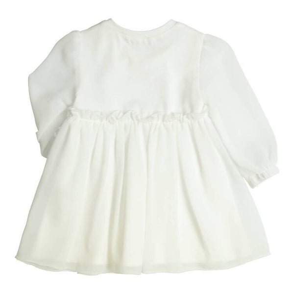 Deze jurk straalt eenvoud en elegantie uit met haar verfijnde ontwerp en subtiele details. De elastische tailleband met een sierlijk lint accentueert de pasvorm en geeft een extra speels accent. Dankzij de lange mouwen en zachte stof is deze jurk niet alleen stijlvol, maar ook comfortabel. Perfect voor speciale gelegenheden zoals verjaardagen, communies of familiediners. Een tijdloze keuze voor de garderobe van elke kleine fashionista. Gemaakt van soepelvallende crêpe georgette.