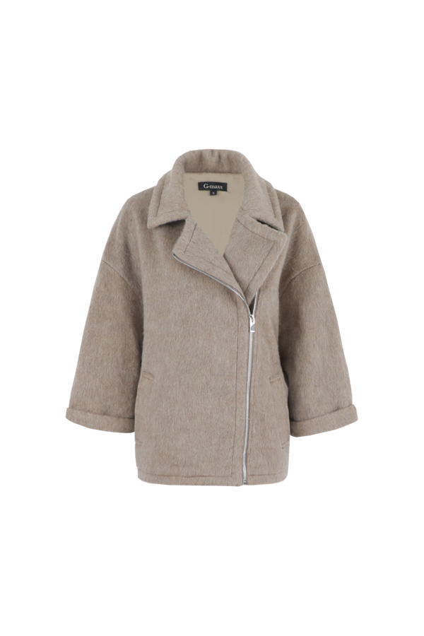 De Martina jacket is een stijlvolle en comfortabele jas die moeiteloos warmte en elegantie combineert. De jas heeft een nonchalant recht model met een opstaande reverskraag en een opvallende asymmetrische ritssluiting voor een moderne twist. De brede mouwen met omslag geven de jas een extra speelse uitstraling. Draag de Martina jacket over een coltrui en jeans voor een ontspannen look.