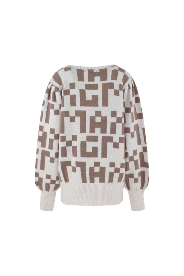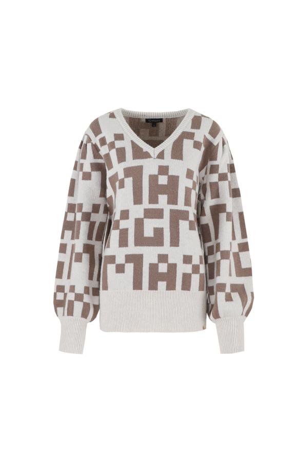 De Mavina trui geeft je look direct een modieuze upgrade. Met de speelse geometrische print en diepe V-hals straalt de trui zowel lef als vrouwelijkheid uit. De ballonmouwen en zachte knit zorgen voor een comfortabele pasvorm met een trendy twist. Perfect te combineren met een jeans of pantalon voor een stijlvolle everyday outfit.