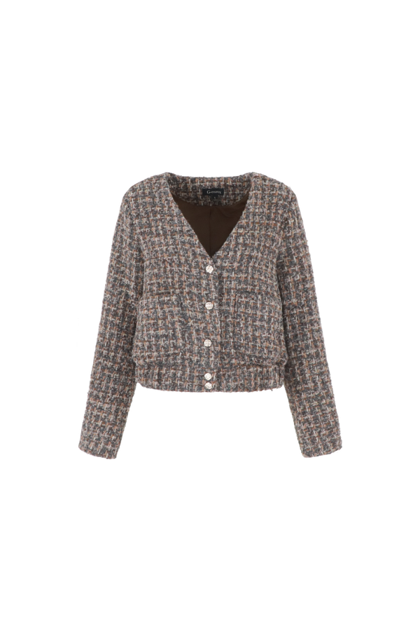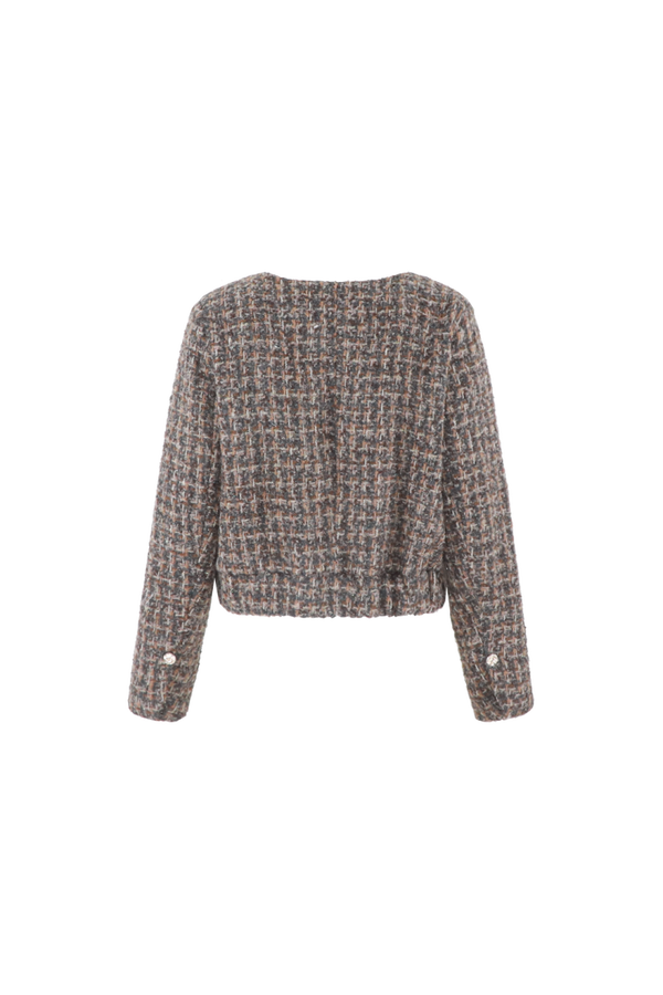 Het Sakura jacket is een chique jasje met een tijdloze bouclé look. De glanzende knopen en subtiele kleurcombinatie zorgen voor een elegante uitstraling. Dankzij het korte model draag je dit jasje zowel stijlvol op een pantalon als casual met jeans. Een veelzijdig item dat elke outfit een classy touch geeft!