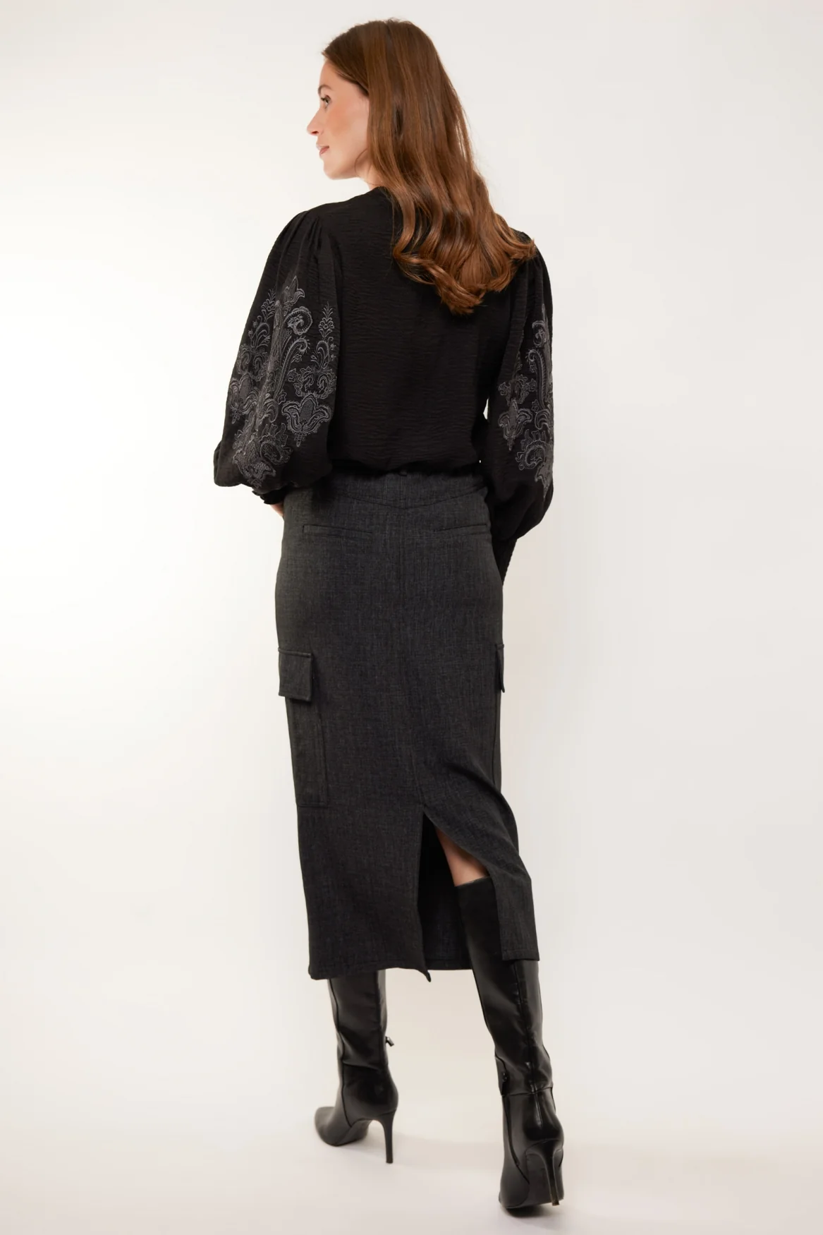De Eldina rok is een stijlvolle winterfavoriet met een midi A-lijn pasvorm. Het ontwerp bevat een subtiele split aan de achterzijde voor extra bewegingsvrijheid en grote, praktische zakken die zowel functioneel als modieus zijn. Gemaakt van warme, hoogwaardige stoffen, biedt deze rok een perfecte balans tussen elegantie en comfort.