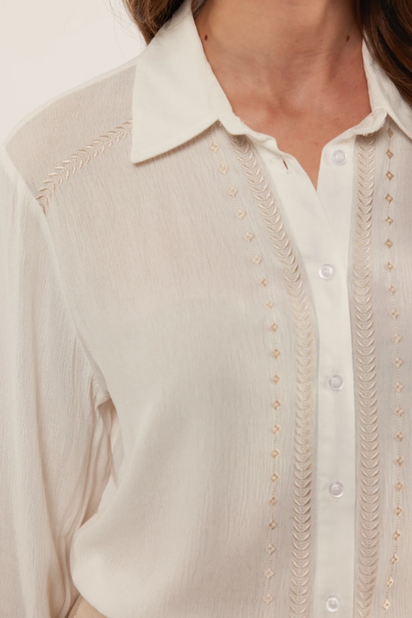 Deze elegante witte Senne blouse straalt verfijning uit met haar subtiele sierlijke broderie. De luchtige stof en geraffineerde details maken dit een veelzijdig en stijlvol kledingstuk. Perfect voor zowel formele als casual gelegenheden.